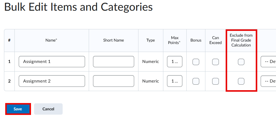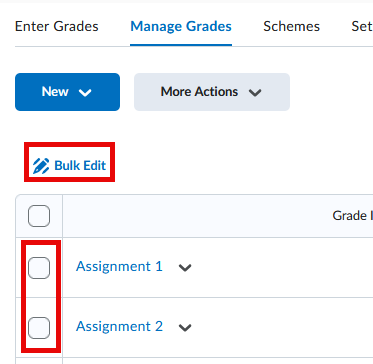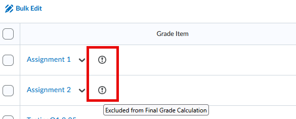 - Select the checkboxes next to the grade items you want to exclude from the final grade, then choose Bulk Edit.