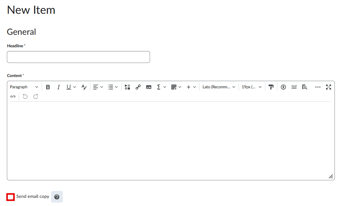 Important: When copying an entire course or selected news item(s) to another course site, the Send Email Copy checkbox resets. Before publishing, reselect the checkbox if needed.