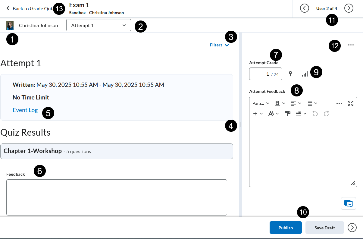 - Publish or Save Draft. It is best practice to save draft and publish all after grading each submission.