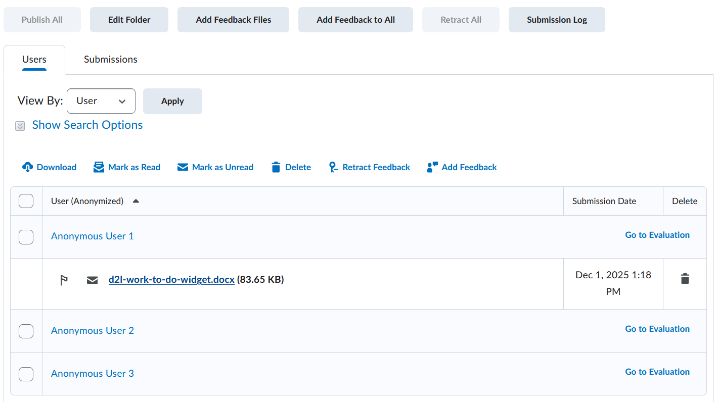 - Under Assessments > Dropbox, select the title of the dropbox folder or View Submissions under the drop-down menu.