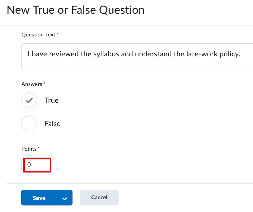Instructors can assign zero points to any quiz question to collect feedback or non-graded information. For example, you can use it to make students accountable for reading the syllabus.