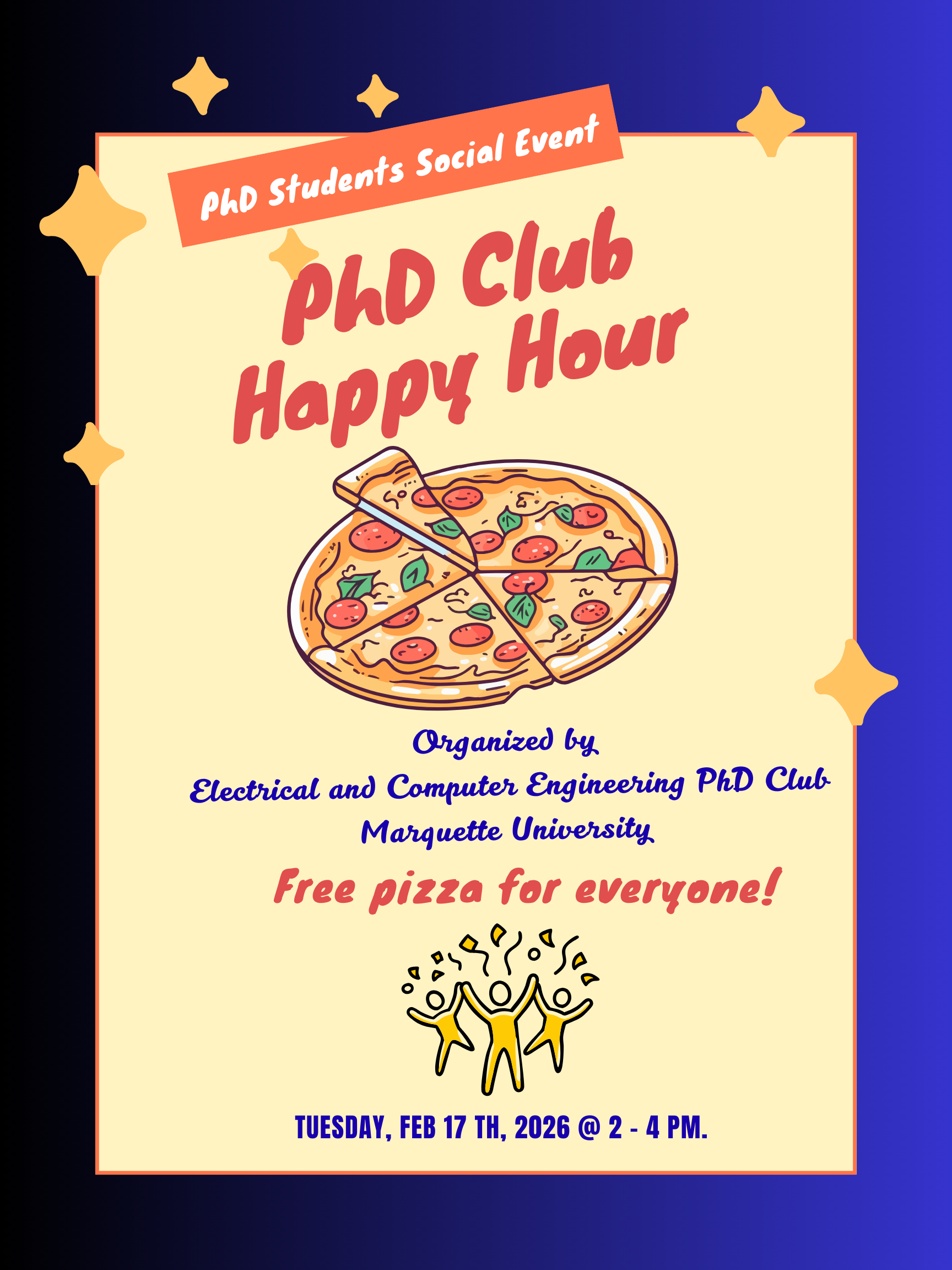 - February 17: Ph.D. Club pizza and social hour