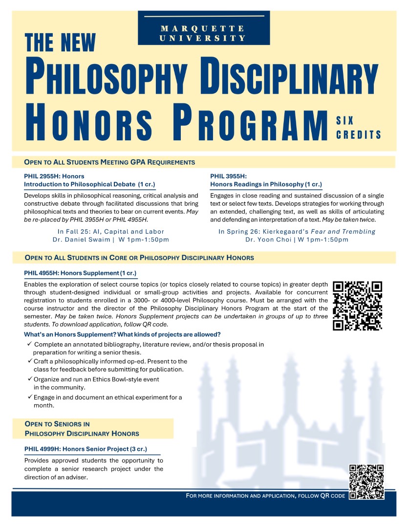 Prerequisites: Either admission to Marquette University Honors Program, cumulative GPA of 3.200 and cumulative Philosophy GPA of 3.330, or cons. of dept.